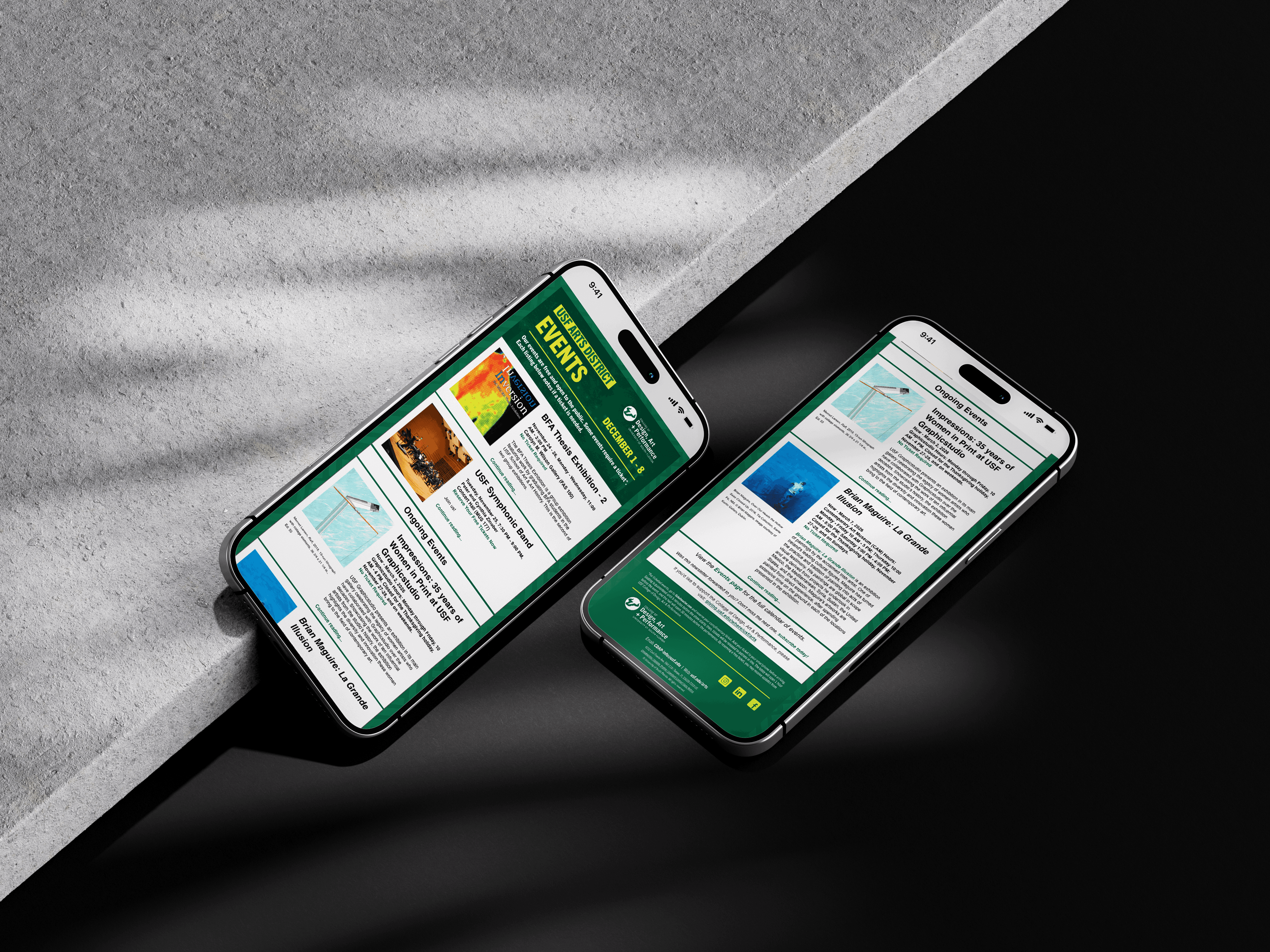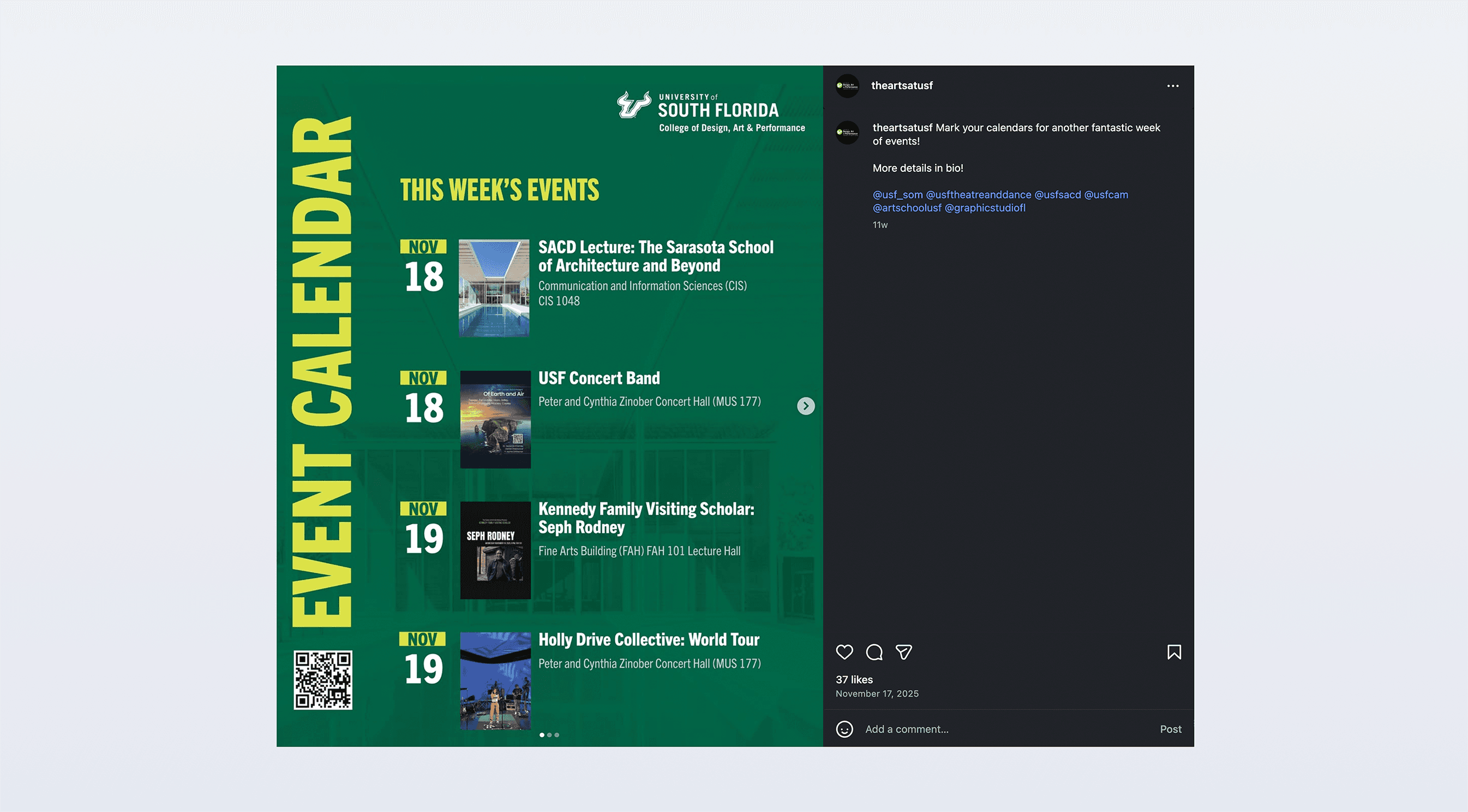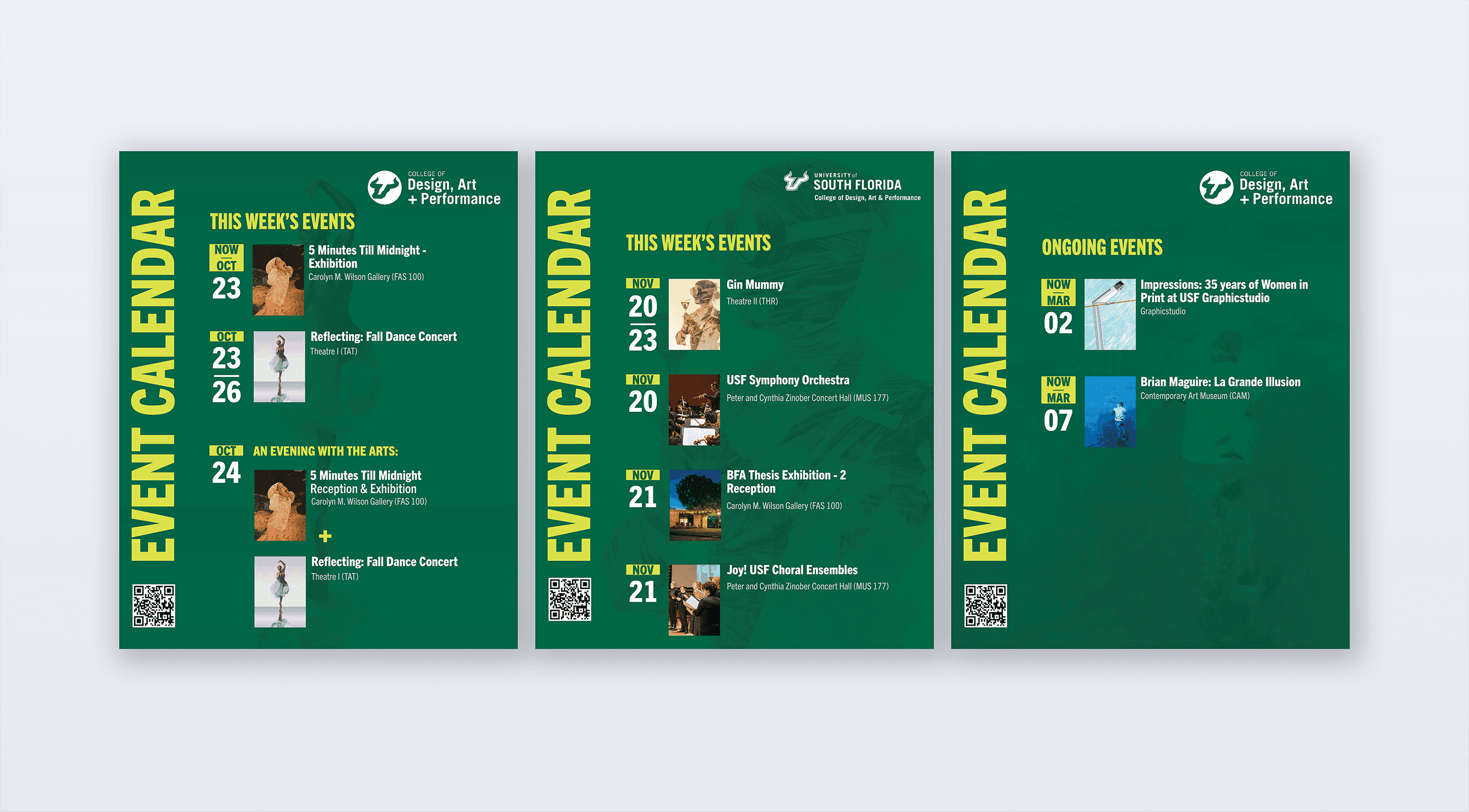 This role focused on supporting promotional efforts for the University’s College of Design, Art, and Performance (CDAP) through strategic content and visual design. A structured content schedule was introduced to better highlight program initiatives, events, and student work across digital platforms. A branded template system was developed for the Design, Art & Performance Calendar to ensure consistency across social media promotions. In addition, an email newsletter for Arts at USF was designed and distributed to a mailing list of over 9,200 subscribers, strengthening audience outreach and engagement. Ongoing collaboration with the Marketing & Communications team ensured all deliverables met brand standards and were executed accurately under strict deadlines.